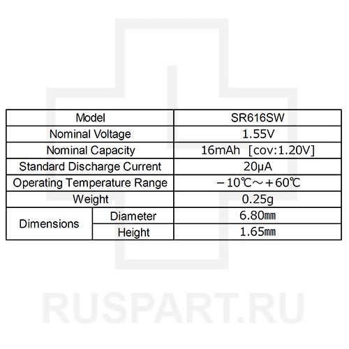 Батарейка кнопочная, оксид серебра RENATA SR616SWОписание: упаковка 10 шт