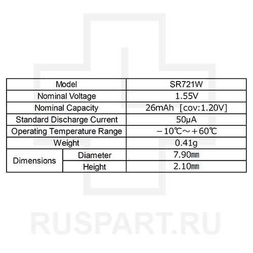 Батарейка кнопочная, оксид серебра RENATA SR721WОписание: упаковка 10 шт