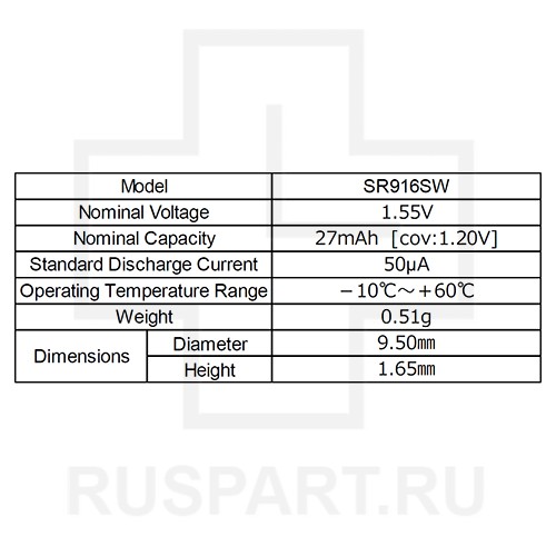 Батарейка кнопочная, оксид серебра RENATA SR916SWОписание: упаковка 10 шт