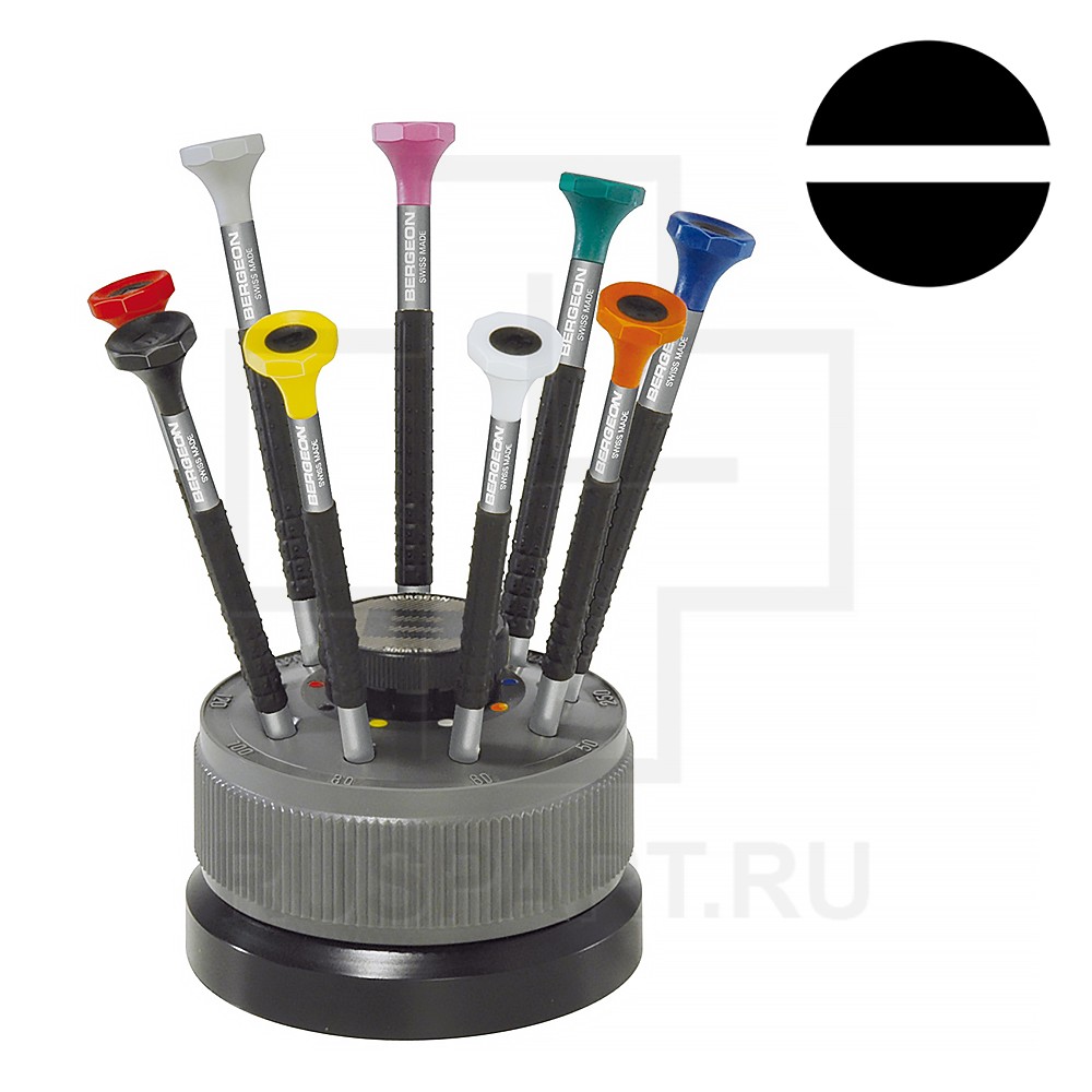 Набор отверток BERGEON SALEОписание: Набор из 10 эргономичных отверток из нержавеющей стали со сменным жалом. Головка из самосмазывающегося синтетического материала POM. Вращающаяся подставка. В комплекте пластиковые тубусы со сменными ж…
