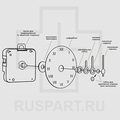 механизм дискретным ходом, с винтом, высота 14 мм, с секундной стрелкой, прозрачная задняя крышка, с кронштейном для настенного подвеса