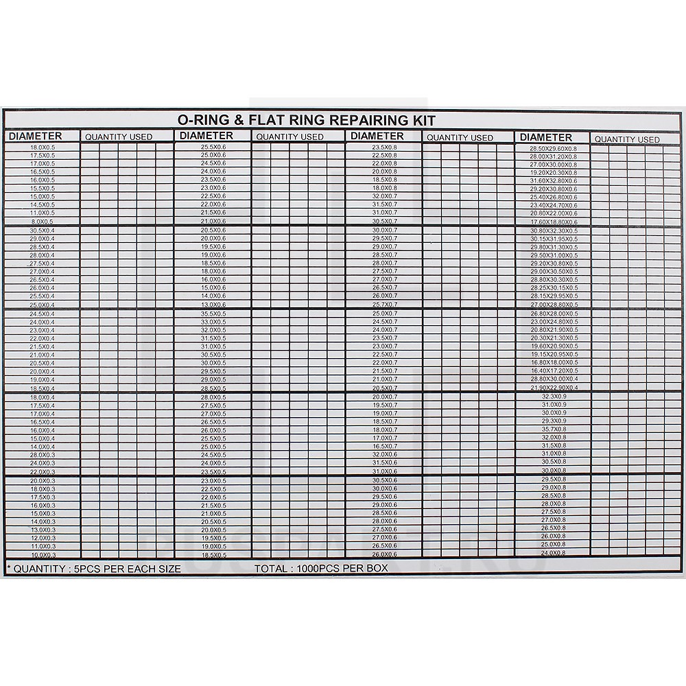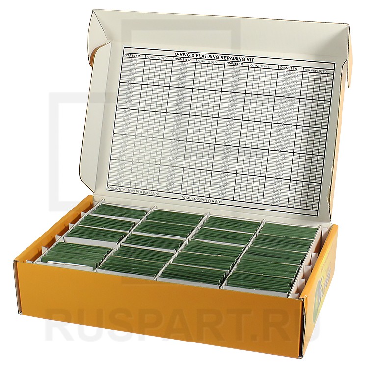 В набор входят уплотнители О-образные (O-Rings) и плоские (Flat Rings) различных диаметров и толщин. Всего в наборе 200 разновидностей по 5 шт. каждого вида.