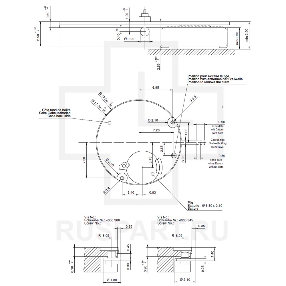 Механизм часовой в сборе RONDA 775 HH1 D3Описание: MOVEMENT RONDA 775, SIZE 7 3/4''', SWISS MADE, 3 HANDS, AIG1, HH1 (HAND FITTING HEIGHT No 1), DATE AT 3