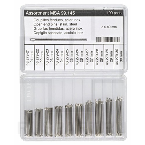 10x MSA46.279-21 /-22 /-23 /-24 /-25 /-26 /-27 /-28 /-29 /-30 ASSORTMENT OF OPEN-END PINS, STAINLESS STEEL / 0.80 mm / 100 PIECES