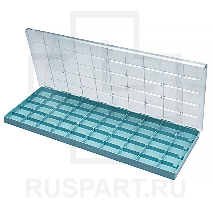 50 отд. (10x8x4, 50 мм) с синим дном и прозрачной крышкой / снаружи 121 x 55 x 11 мм