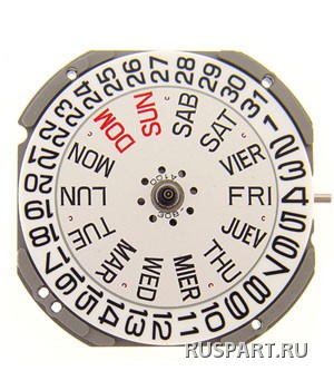 Механизм часовой в сборе MIYOTA GR02Описание: MOVEMENT MIYOTA GR02, SIZE 11 1/2''', 3 HANDS, STANDARD HAND HEIGHT, DATE AT 3 DAY AT 3, H 2.94 mm