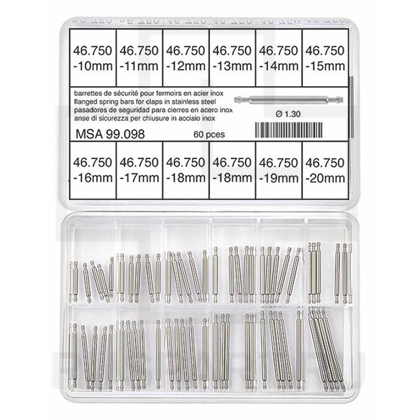 ASSORTMENT OF FLANGED SPRING BARS FOR CLASPS, STAINLESS STEEL / 1.30 mm / 60