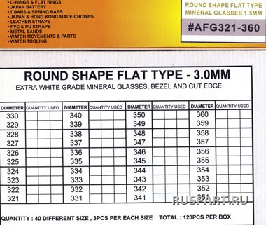 Набор плоских круглых стекол в компактной упаковке. Толщина 1.5мм. Диаметры от 321 до 360.