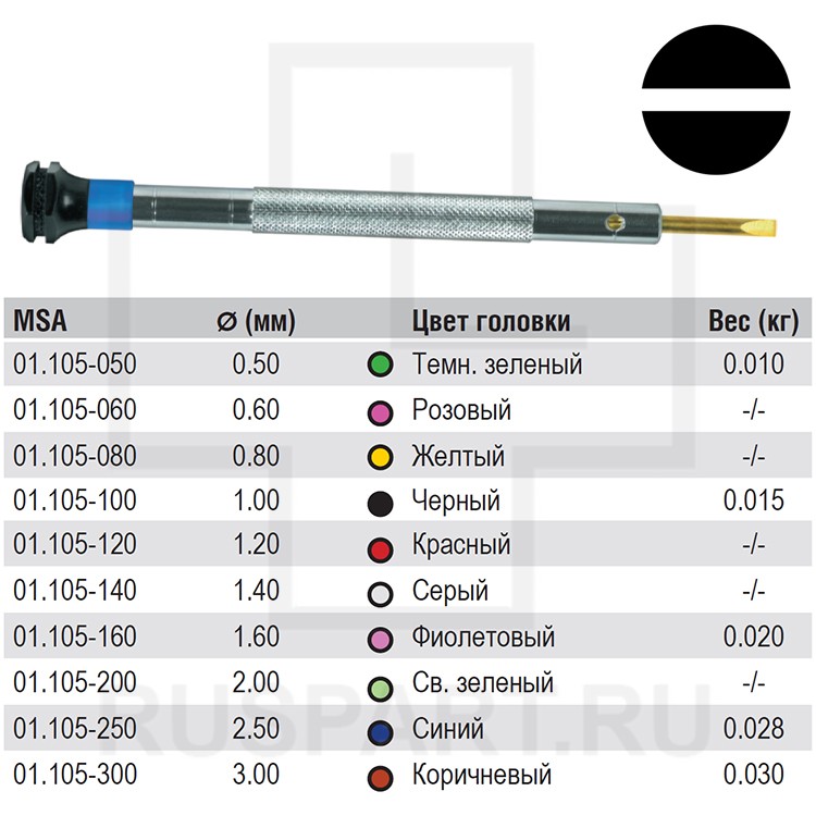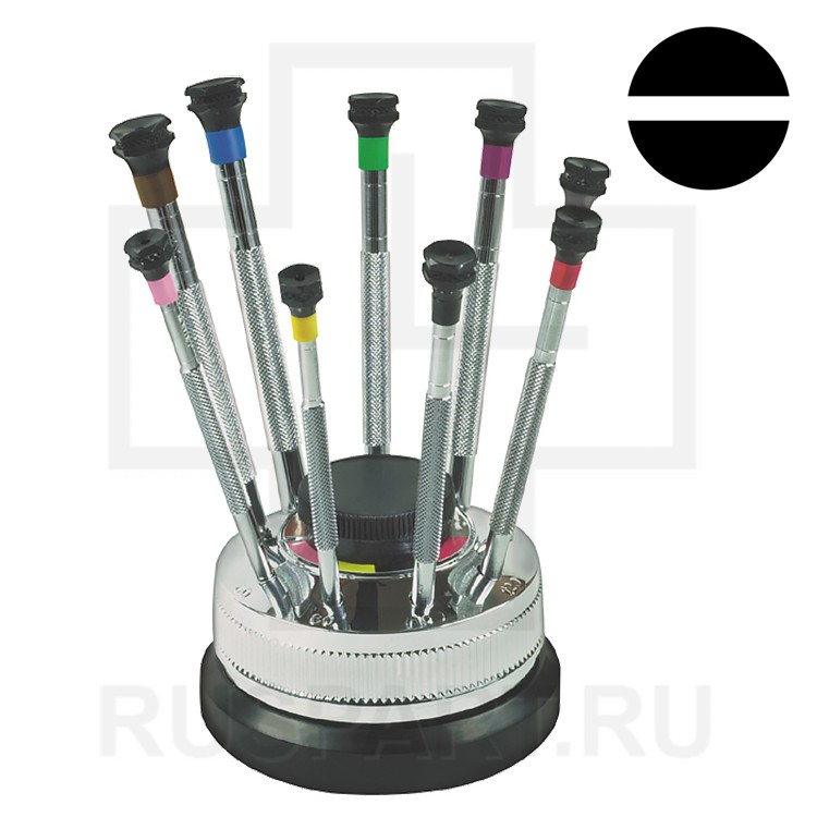 Набор из 9 антимагнитных плоских прецизионных отверток MSA 01.105-xxx на хромированной черной вращающеся подставке. Поставляется с 19 запасными жалами из бериллиевой бронзы и 2 винтами, хранящимися в специальном отсеке в центре подставки.