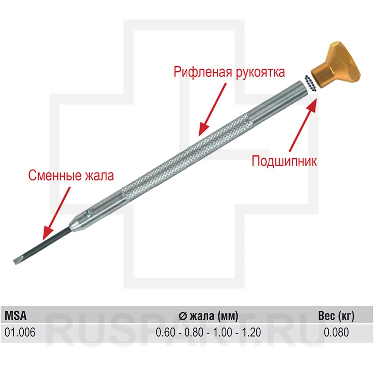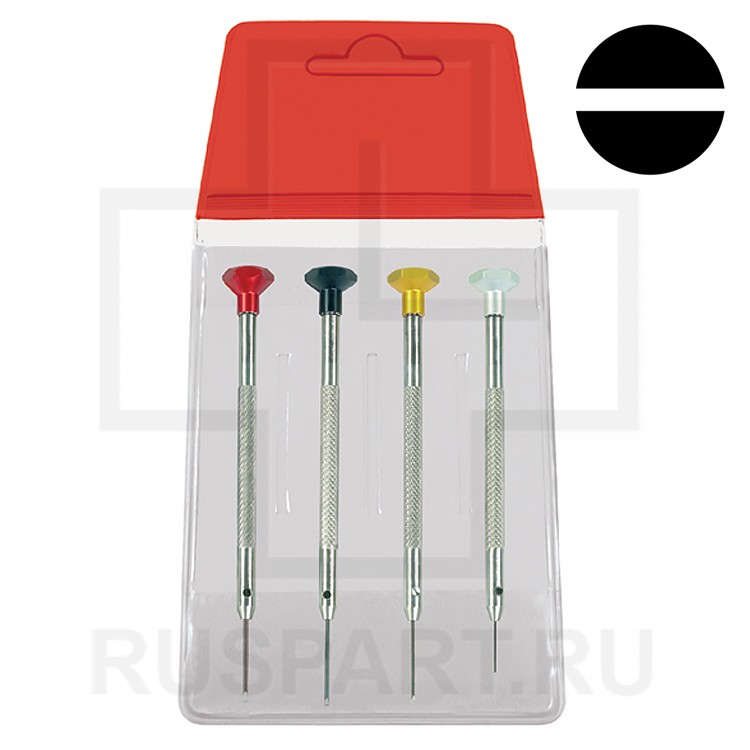 Набор из 4 часовых отверток с рифленой стальной рукояткой MSA 01.201-xxx. Поставляется в пластиковой упаковке.