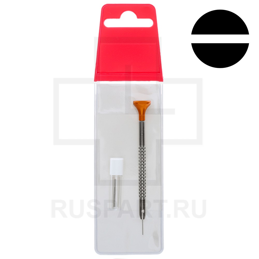 Часовая отвертка с рифленой стальной рукояткой MSA 01.201-xxx. Поставляется в пластиковой упаковке с 3 запасными жалами в пластиковом тубусе.