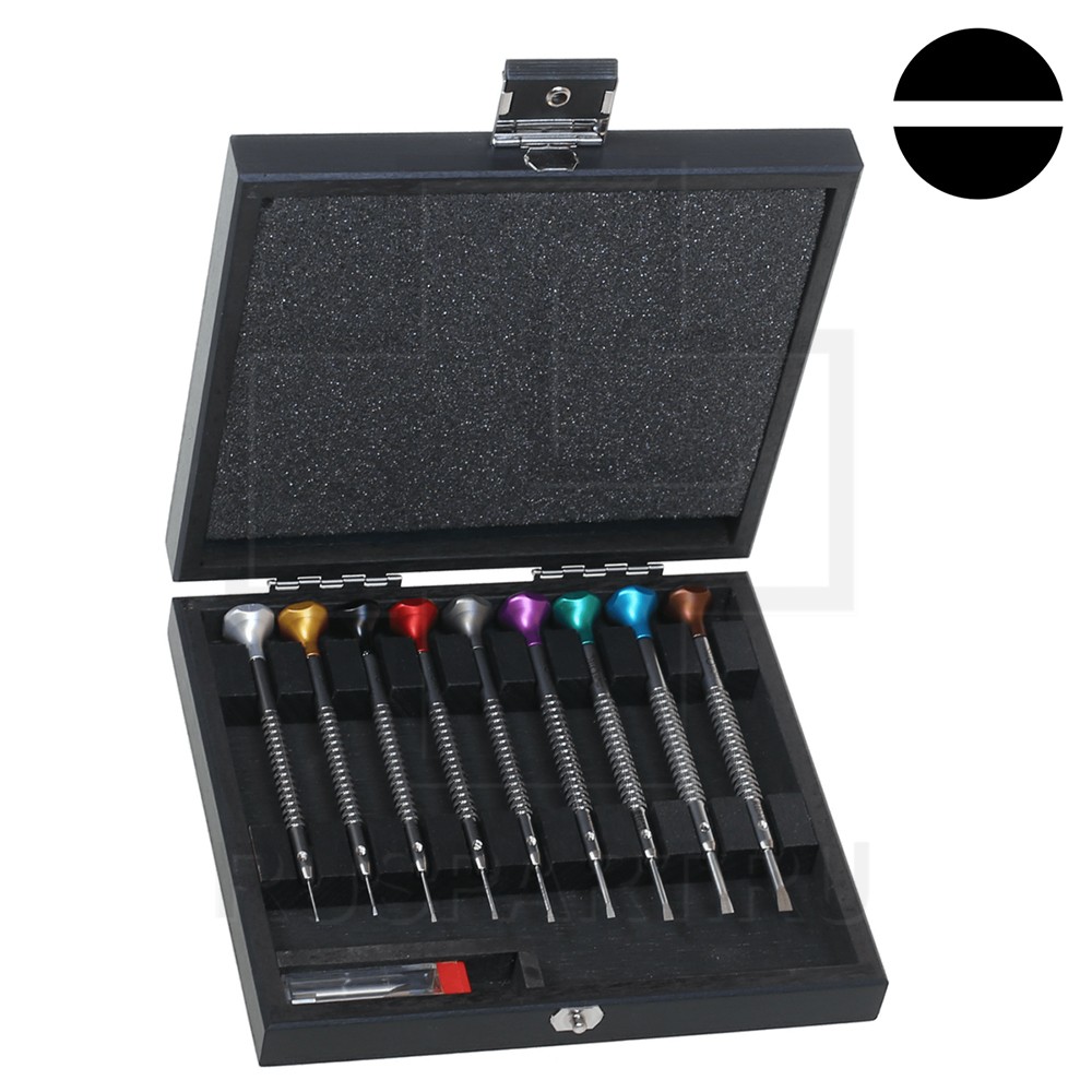 Набор из 9 отверток с подшипником. Поставляется в деревянной коробке с 9 сменными жалами MSA01.215-xxx из нержавеющей стали и 2 крепежными винтами MSA01. 218-V.