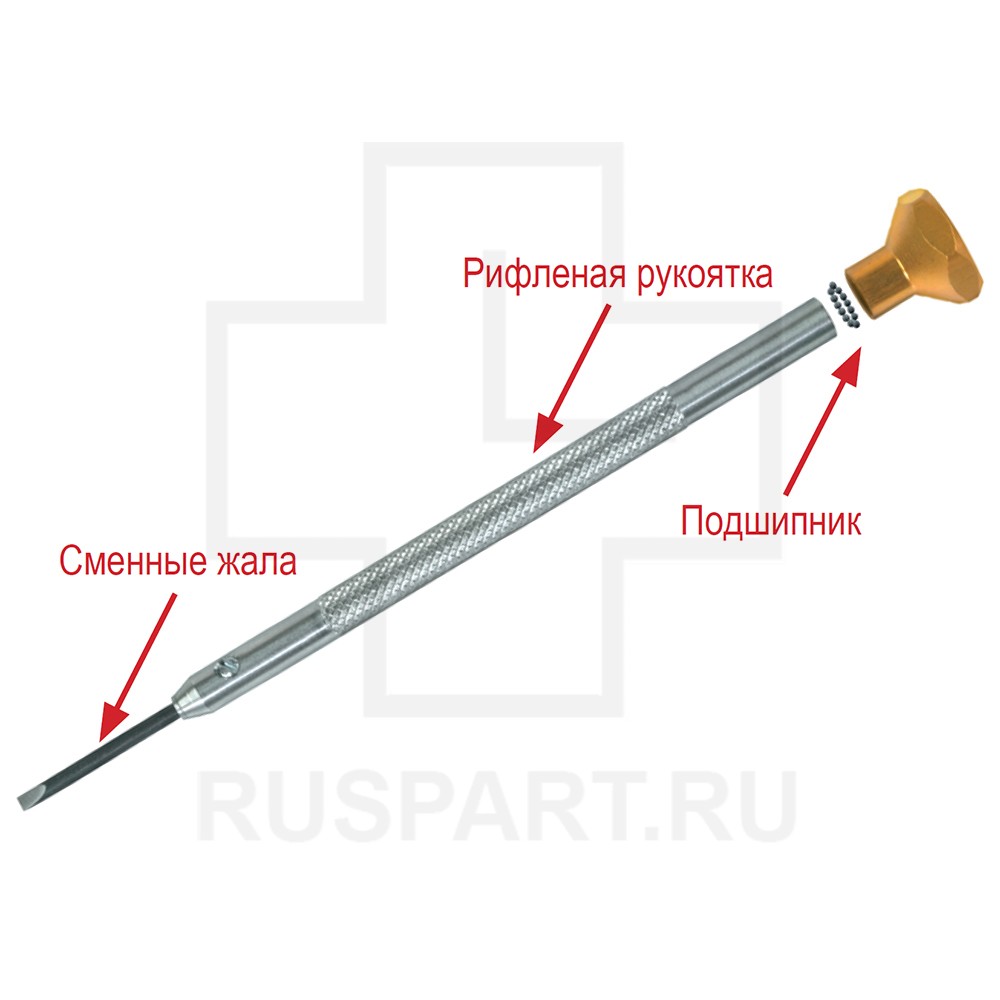 Часовая отвертка. Рифленая стальная рукоятка, шестиугольная поворотная головка рукоятки с подшипником и съемные жала из закаленной стали. Поставляется поштучно.