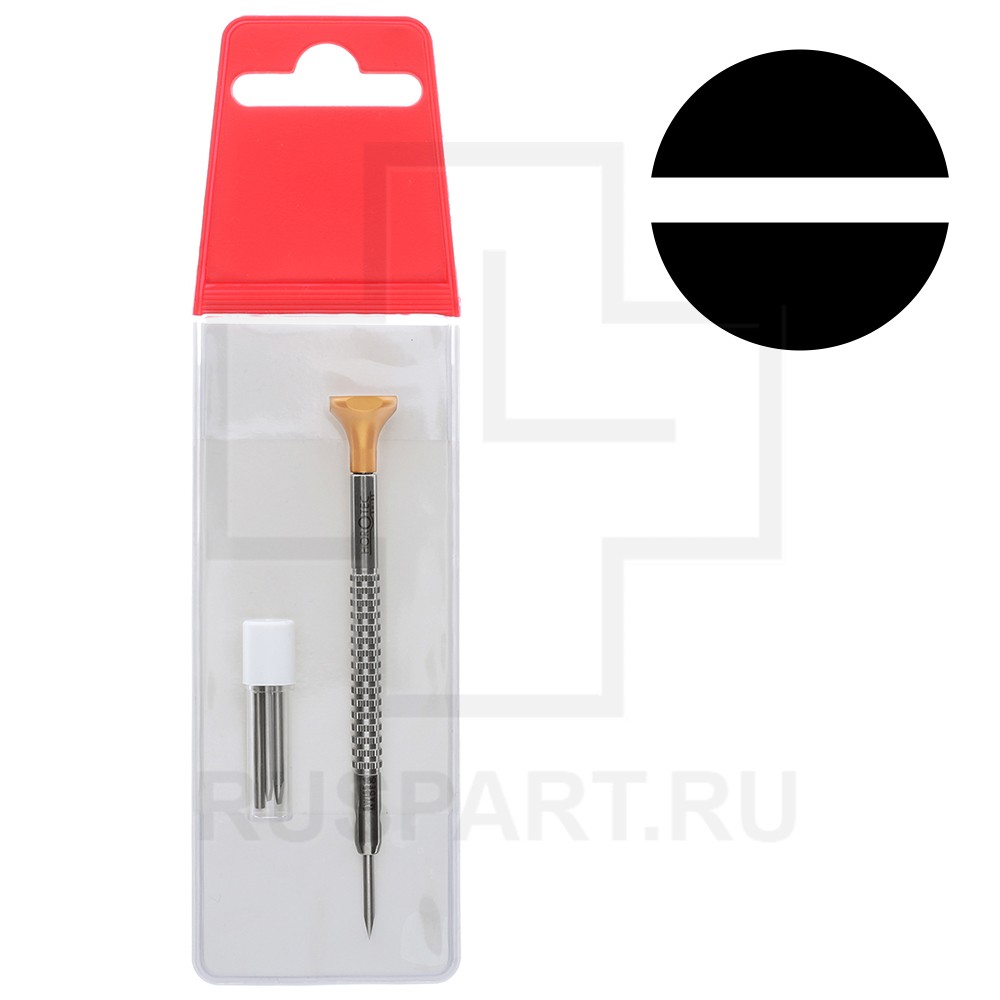 Часовая отвертка с рифленой стальной рукояткой MSA 01.201-xxx. Поставляется в пластиковой упаковке с 3 запасными жалами в пластиковом тубусе.