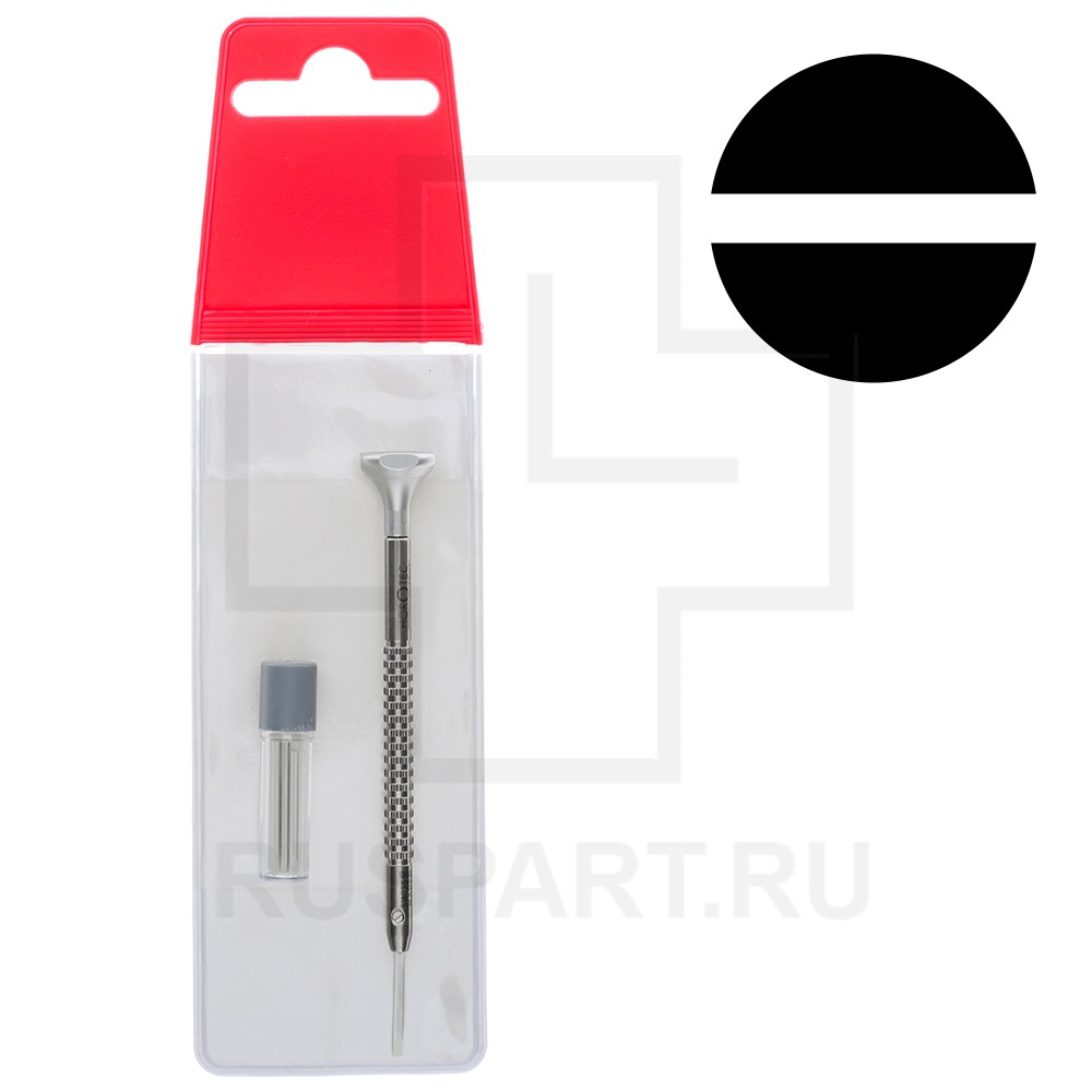 Часовая отвертка с рифленой стальной рукояткой MSA 01.201-xxx. Поставляется в пластиковой упаковке с 3 запасными жалами в пластиковом тубусе.