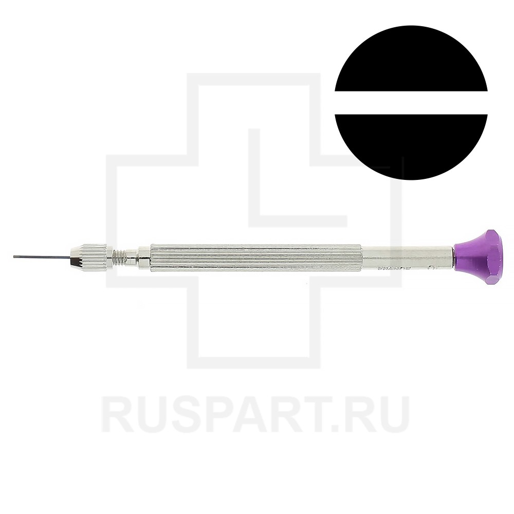 Плоская реверсивная отвертка с рифленой рукояткой из хромированной латуни, цветной головкой и сменным стальным жалом. Поставляется поштучно с жалом. Приблизительная длина 80 мм.