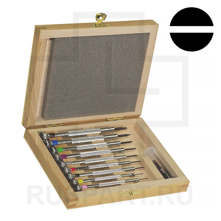 Набор из 9 классических прецизионных отверток MSA 01.101-xxx. Поставляется в деревянном футляре с 19 запасными жалами из закаленной стали и 2 винтами (в пластиковом тубусе).