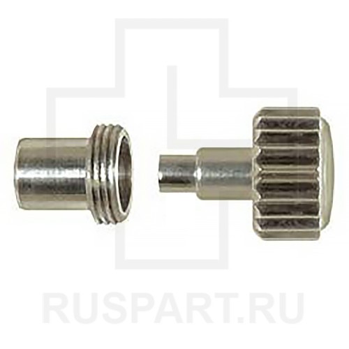 Винтовая головка из нержавеющей стали с втулкой и прокладкой. Стального цвета.