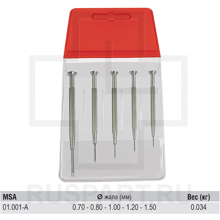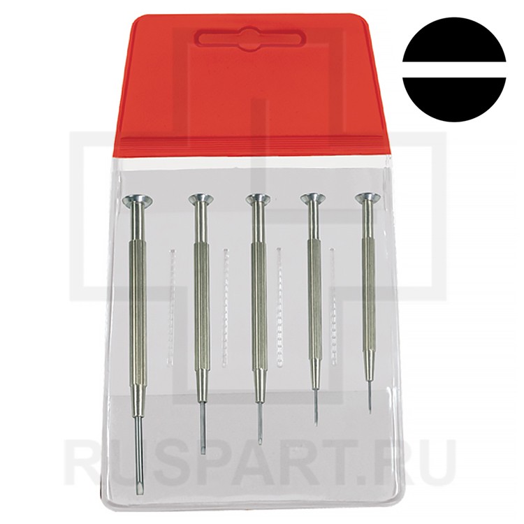 Набор из 5 плоских отверток с фиксированным жалом MSA 01.001-xxx. Поставляется в пластиковой упаковке.