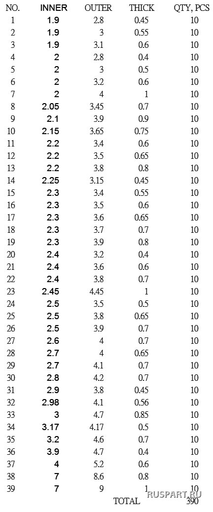 Набор включает 39 различных размеров, по 10 шт. каждого вида, всего 390 шт.