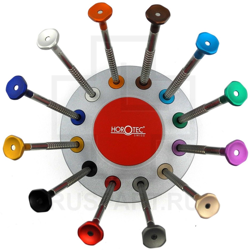 Набор из 12 часовых отверток с рифленой стальной рукояткой MSA 01.201-xxx на прочной алюминиевой нескользящей подставке с подшипниками и с гнездами для отверток с разноцветными метками для быстрого выбора нужного диаметра.