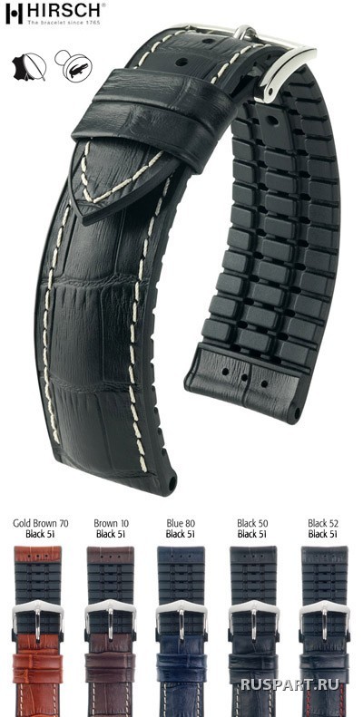 Серия PERFORMANCE. Основа ремня - черный каучук, верхняя кожа - теленок коричневого цвета. 100% антиаллергенность, система влаго- и паропроницаемости , WR-300, защита от царапин гарантия на ремешок - 30 месяцев. Застежка белая, размер 24/22 Лучшая итальянская телячья кожа с естественно выглядящим тиснением под аллигатора, полуматовая с характерным двухтоновым эффектом. Сердцевина HIRSCH Premium Caoutchouc. Спортивный классический дизайн. Подчеркнутая запатентованная прошивка. Интегрированный фиксатор ремешка. Высококачественная застежка из нержавеющей стали HIRSCH Classic.