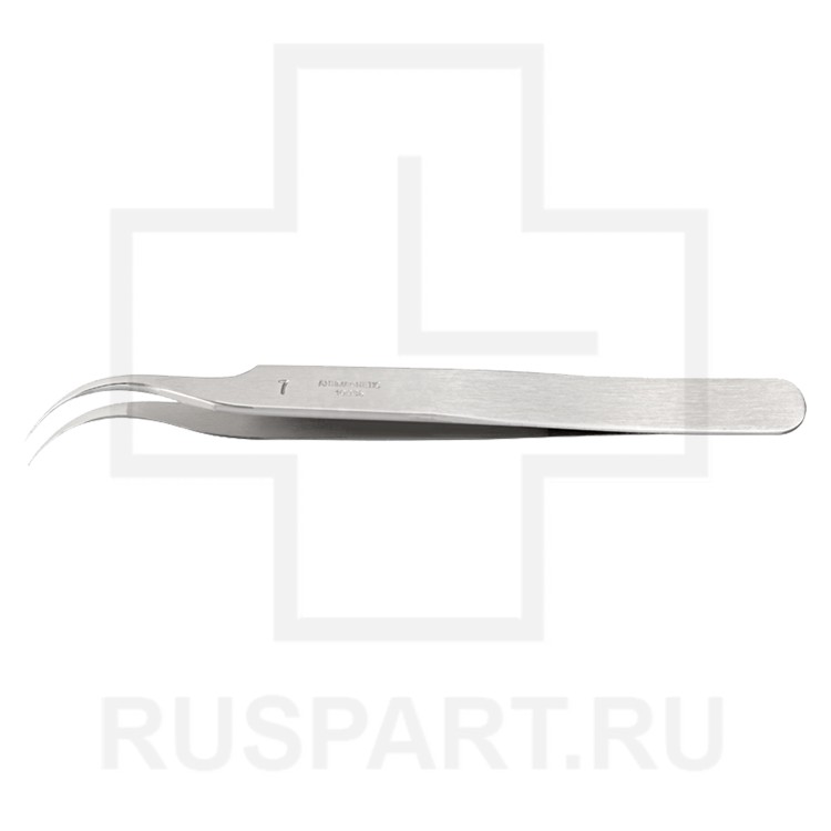 Изогнутый сверхтонкий пинцет из антимагнитной стали с зеркально отполированными наконечниками.