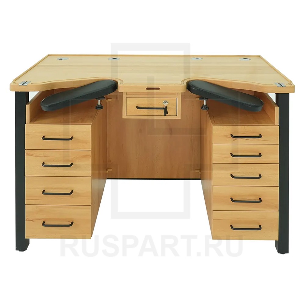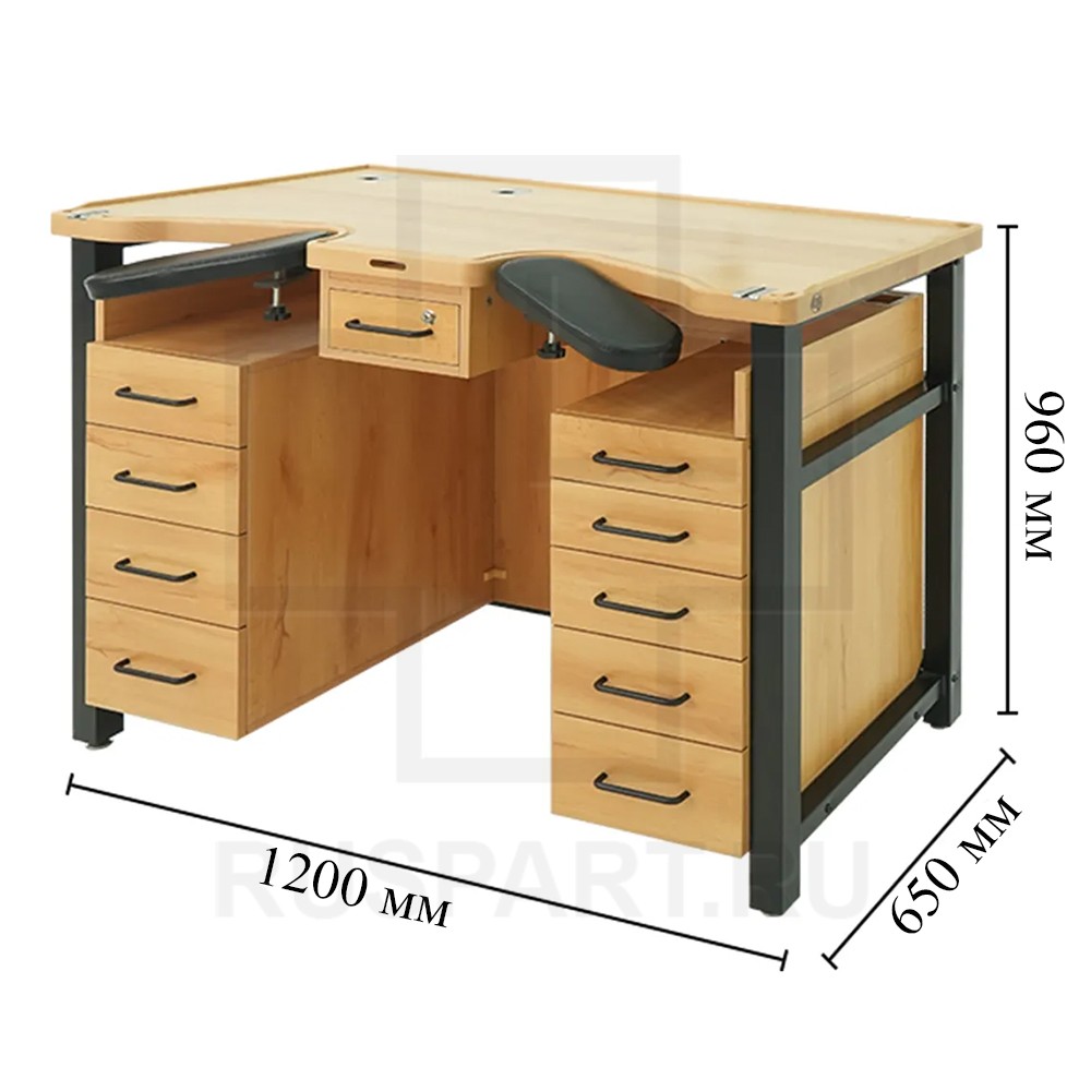 Многофункциональный специализированный стол, отлично подходит для часовщиков. Прочная столешница выполнена из массива бука. Основание из металла с черным покрытием. Регулируемые по высоте подлокотники из искусственной кожи. 5 выдвижных ящиков с правой стороны, 4 выдвижных ящика с левой стороны и 1 выдвижной центральный ящик.