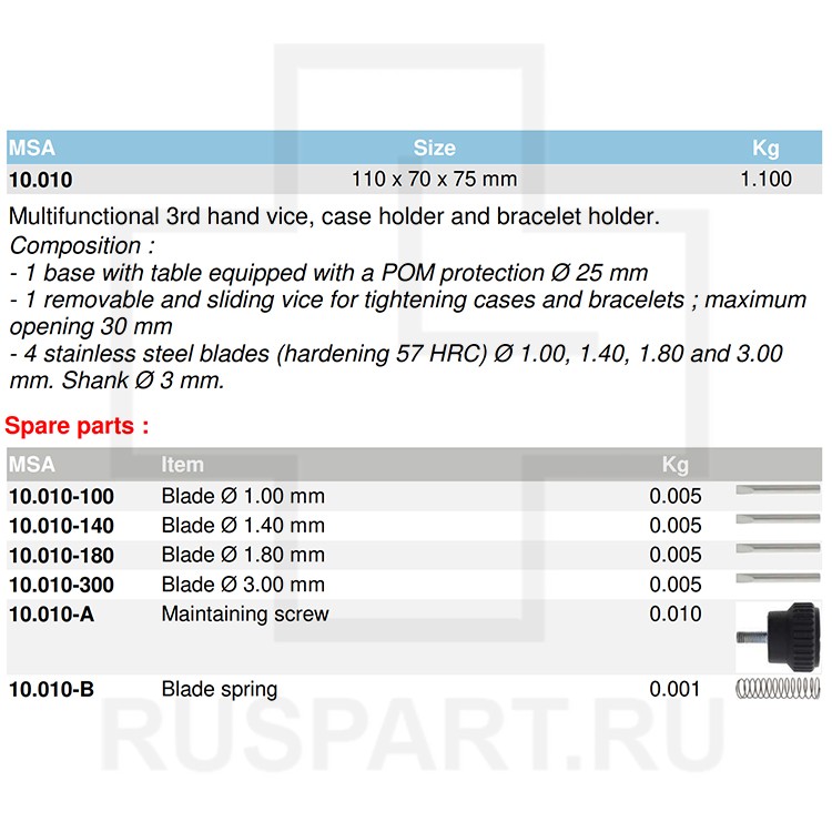 MULTIFUNCTIONAL 3rd HAND VICE - CASE HOLDER AND BRACELET HOLDER, BASE WITH TABLE / REMOVABLE VICE MAXIMUM OPENING 30 mm / 4 STAINLESS STEEL BLADES O 1.00 - 1.40 - 1.80 - 3.00 mm