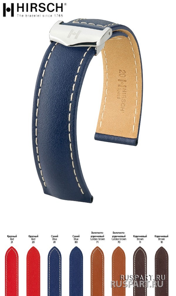 Прочная итальянская телячья кожа с особенно четким зернистым рисунком. Подкладочная кожа HIRSCH Oysterglove Supersoft. Набивка средней толщины. Спортивный кончик ремешка. Строчка контрастная или тон в тон. Поперечный шов на кончике и у застежки. Уникальная складная застежка HIRSCH Magic из нержавеющей стали.