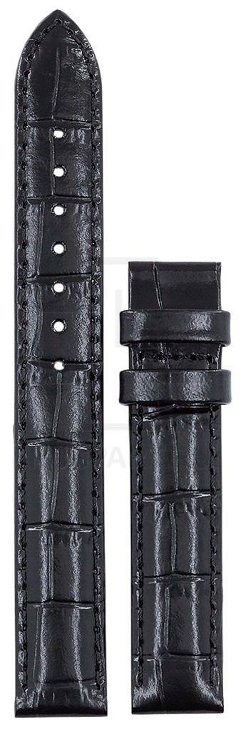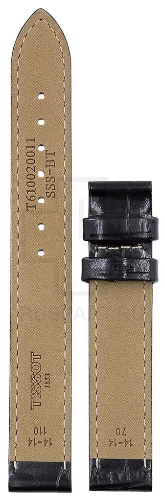 Кожаный ремешок TISSOT черного цвета, без застежки. Ремешок имеет прямое крепление и подходит для всех часов Tissot с прямым креплением. Ремешок черный, имитация крокодила, 14/14, без замка, T-WAVE (L850, T045.207)