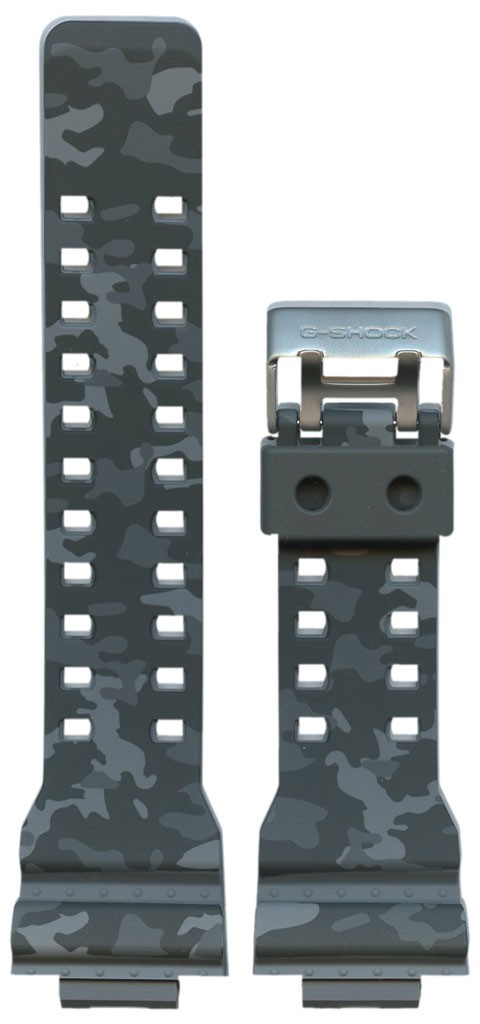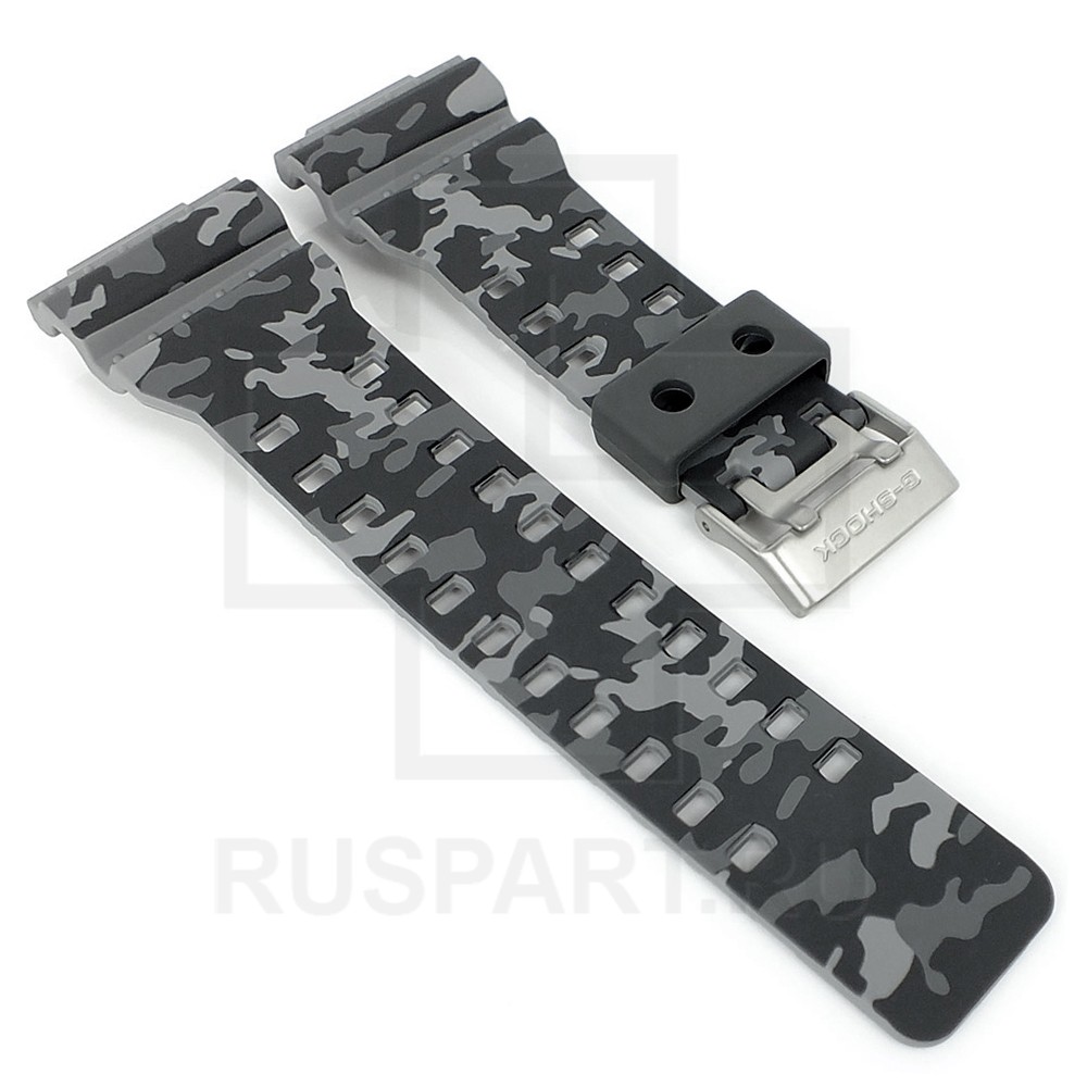 Оригинальный ремешок для часов CASIO G-Shock. Серый, камуфляж. Устойчив к внешним воздействиям. Легко заменяется. Ремешок имеет уникальное крепление и подходит только для указанных моделей.