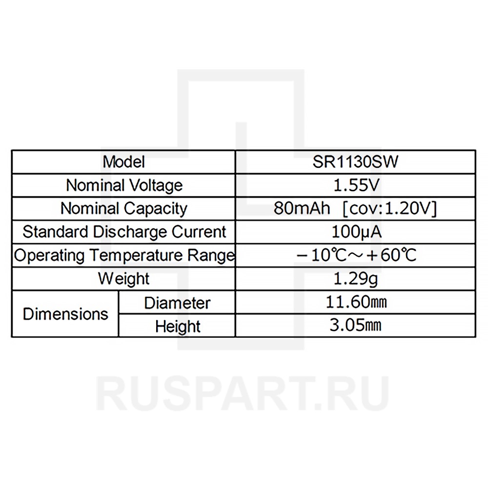 Батарейка кнопочная, оксид серебра RENATA SR1130SWОписание: упаковка 10 шт