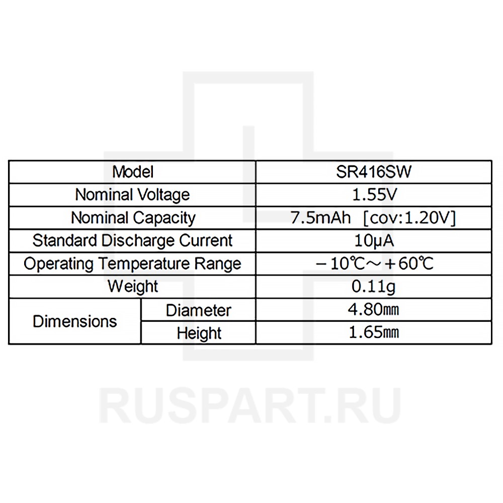 Батарейка кнопочная, оксид серебра RENATA SR416SWОписание: упаковка 10 шт