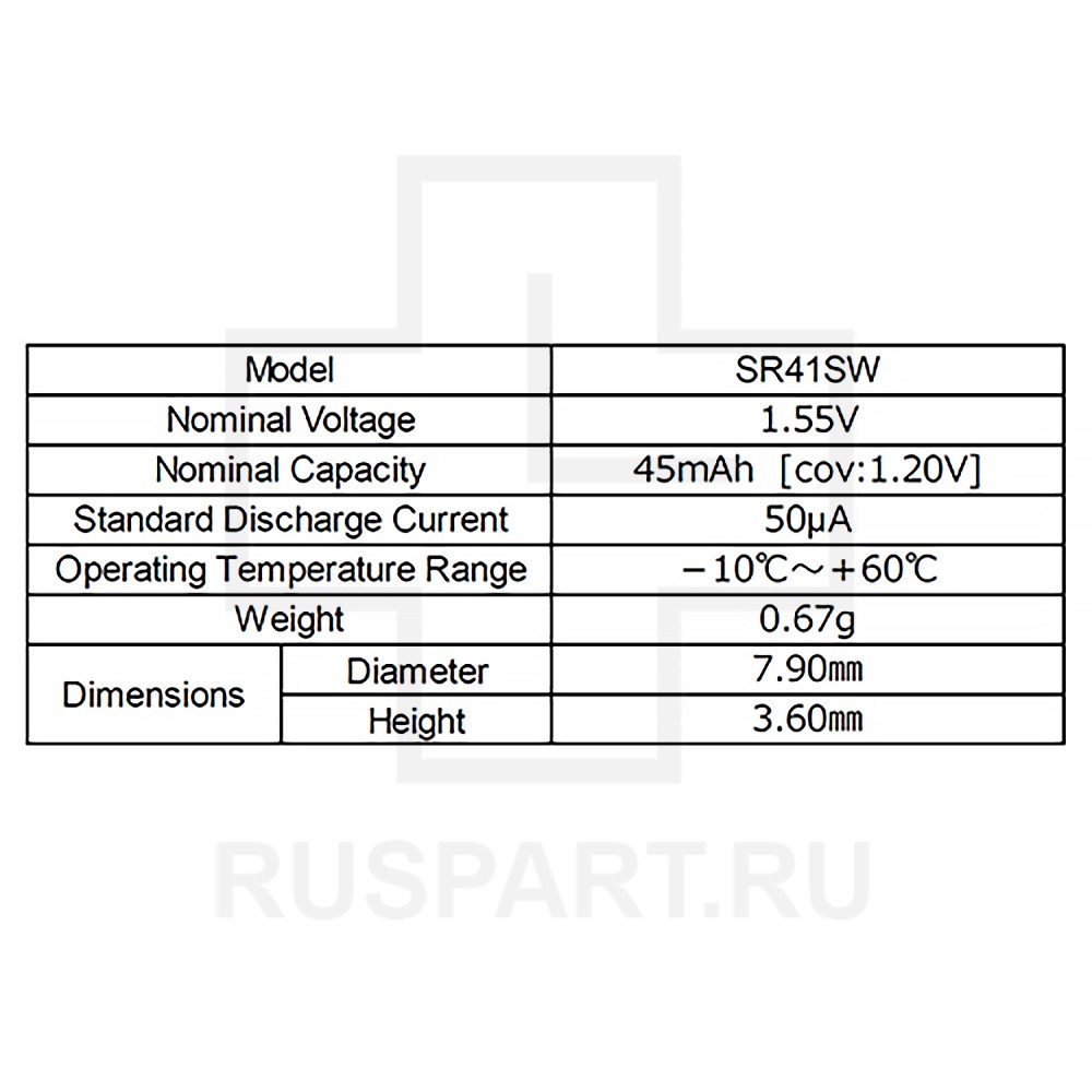 Батарейка кнопочная, оксид серебра RENATA SR41SWОписание: упаковка 10 шт