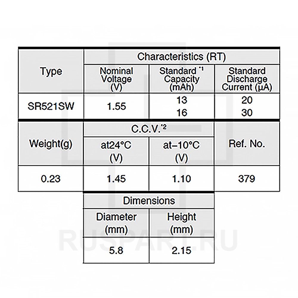 Батарейка кнопочная, оксид серебра RENATA SR521SWОписание: упаковка 10 шт