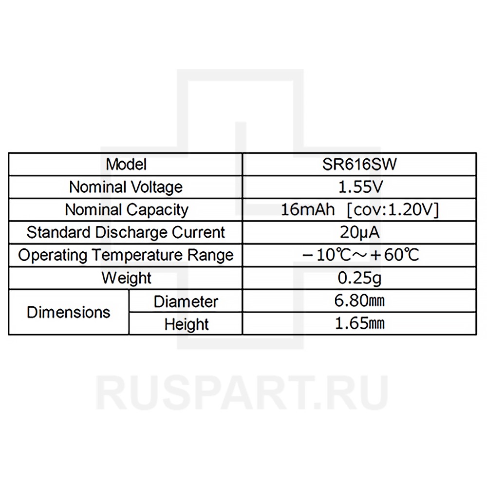 Батарейка кнопочная, оксид серебра RENATA SR616SWОписание: упаковка 10 шт