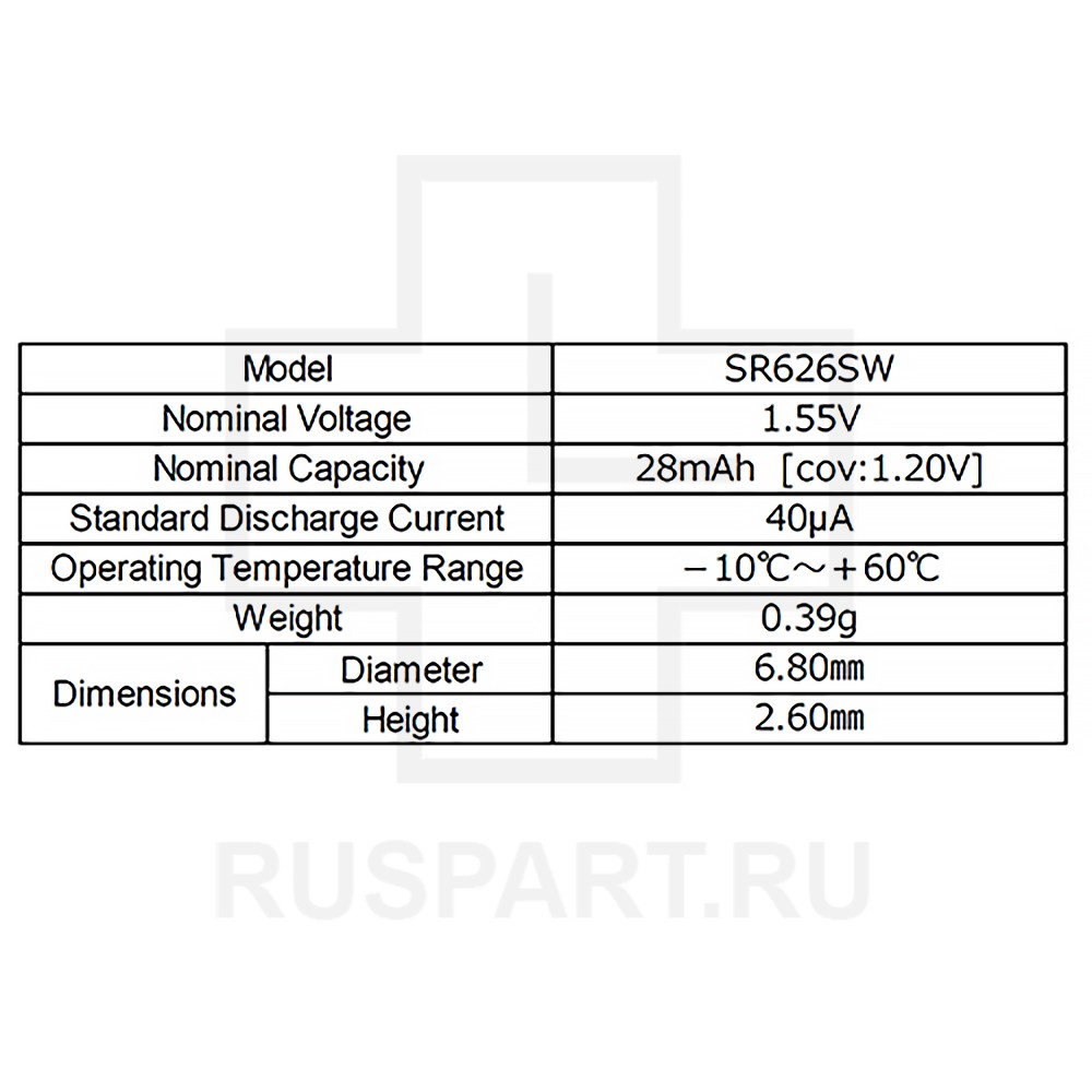 Батарейка кнопочная, оксид серебра RENATA SR626SWОписание: упаковка 10 шт
