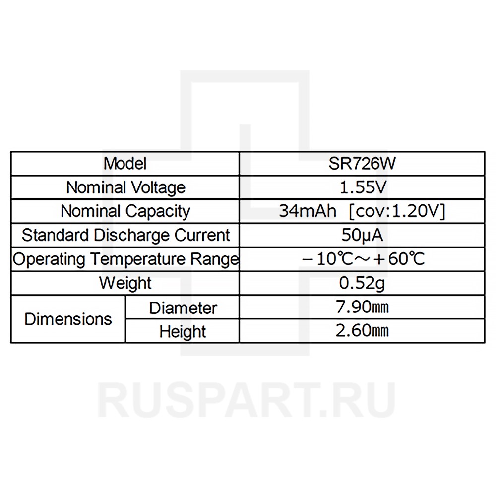 Батарейка кнопочная, оксид серебра RENATA SR726WОписание: упаковка 10 шт