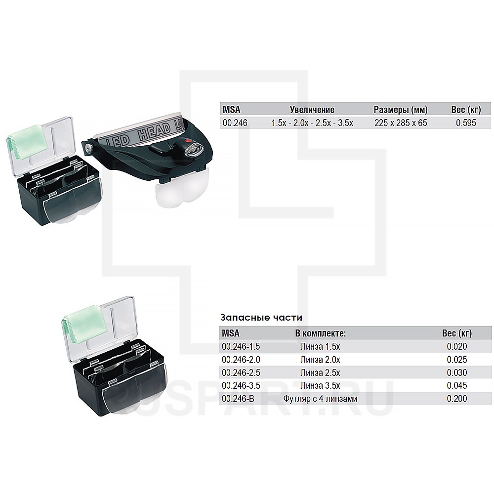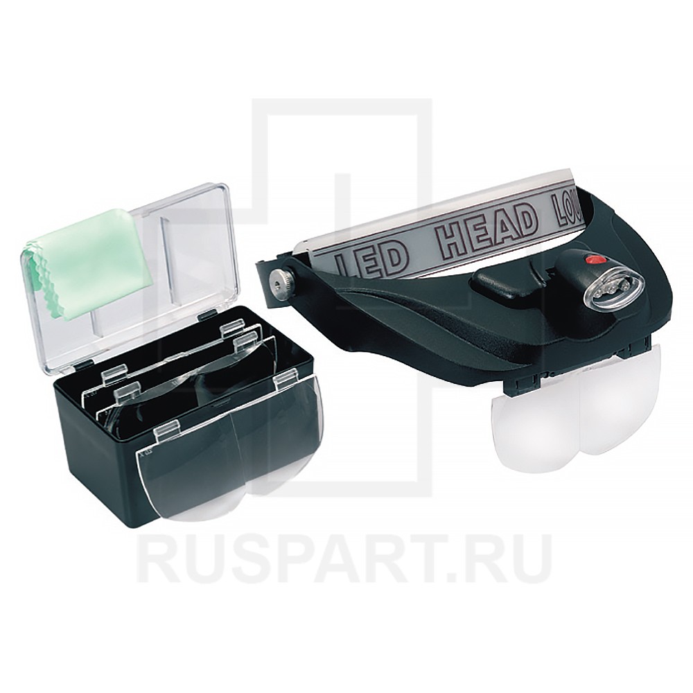 Очки со сменной фронтальной трехламповой подсветкой (около 50000 часов работы), регулируемым оголовником и поворотной линзой. Регулируемое положение подсветки: 30? по горизонтали и 90? по вертикали. Поставляется в пластиковой коробке с 4 сменными линзами из
