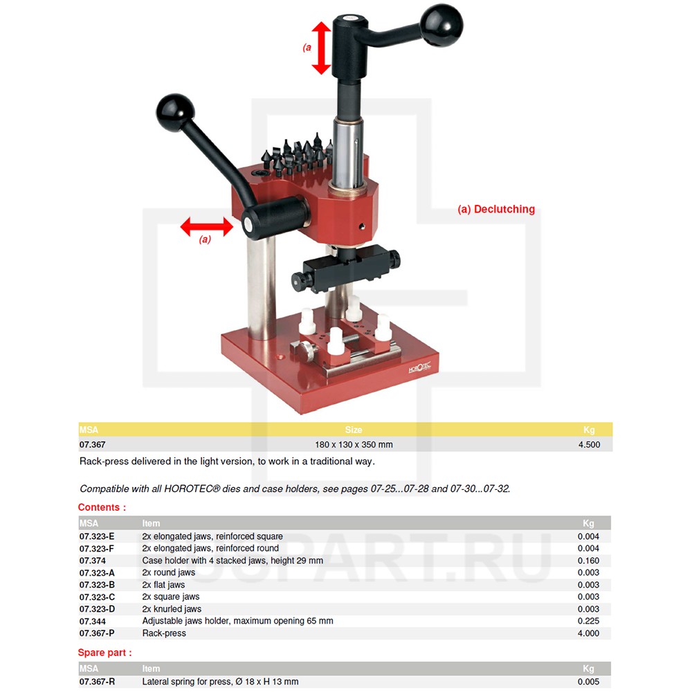 Универсальный ключ, стационарный HOROTEC 07.368Описание: Универсальный пресс для часов. Пресс оснащен двумя ручками: Боковая ручка позволяет снизить или поднять зубчатую рейку для того, чтобы лучше контролировать давление во время отвинчивания/завинчивания …