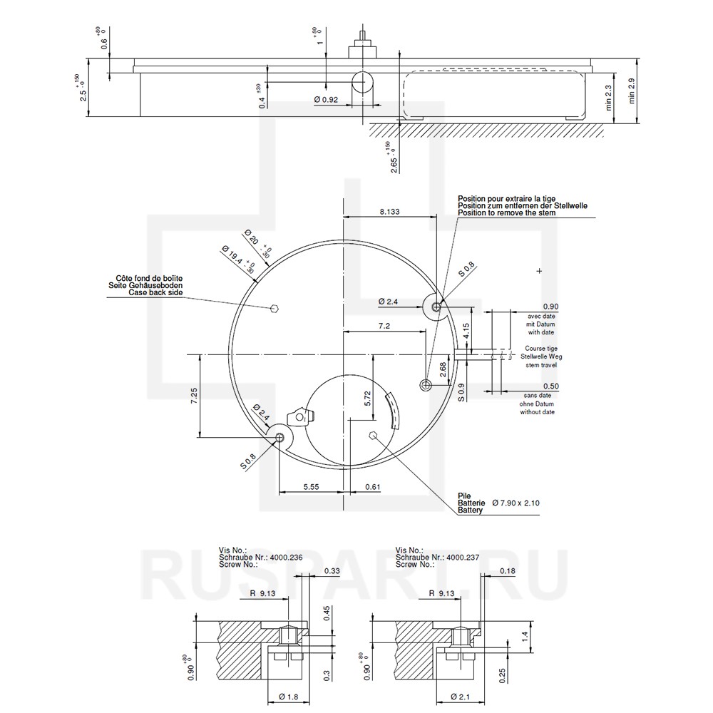 MOVEMENT RONDA 785, SIZE 8 3/4''', 3 HANDS, AIG4, DATE AT 3, H 2.50 mm