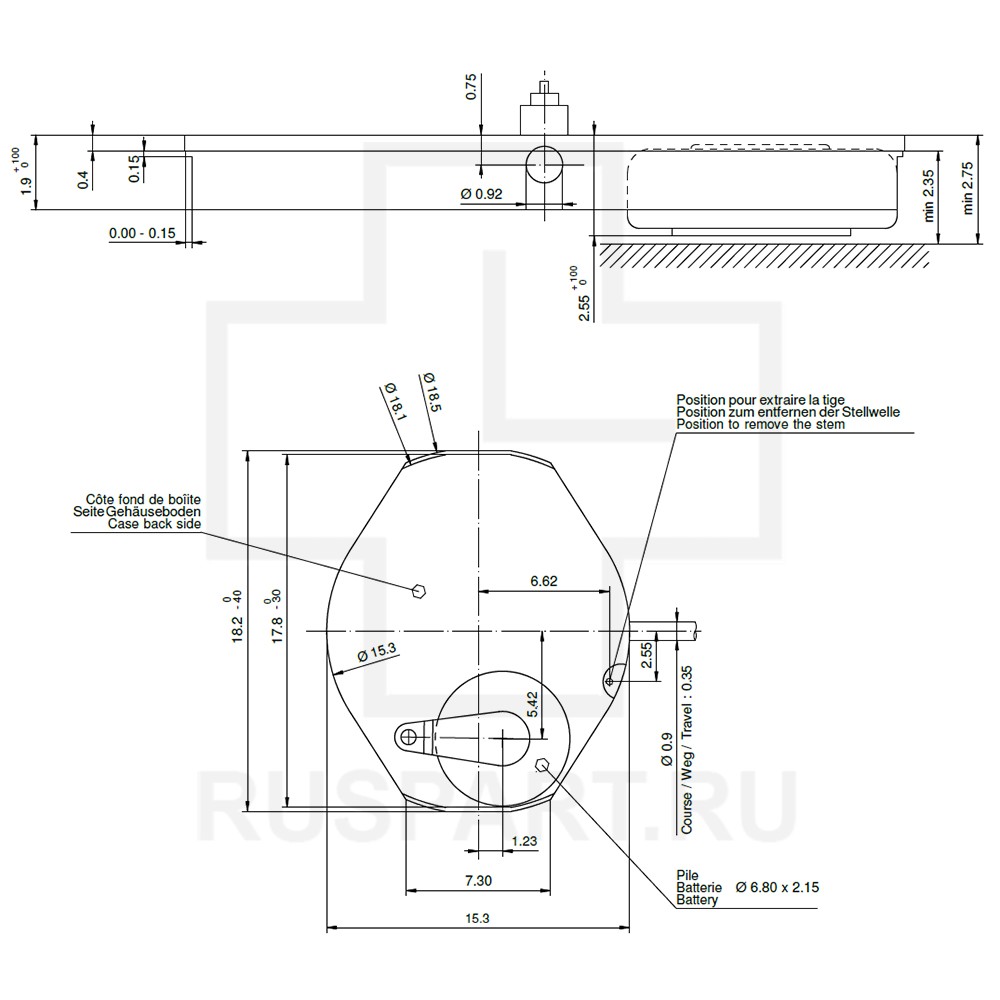 Механизм часовой в сборе RONDA 1063 HH1Описание: MOVEMENT RONDA 1063, SIZE 6 3/4''' x 8''', 3 HANDS, GILT, AIG1 (HAND FITTING HEIGHT No 1) Механизм поставляется только в индивидуальных жестких пластиковых боксах с ложементами.…