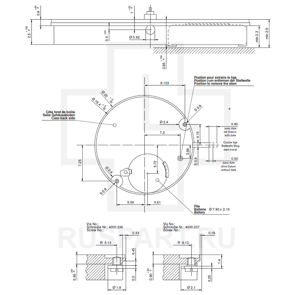 MOVEMENT RONDA 784, SIZE 8 3/4''', 2 HANDS, AIG1, HH1 (HAND FITTING HEIGHT No 1), DATE AT 6