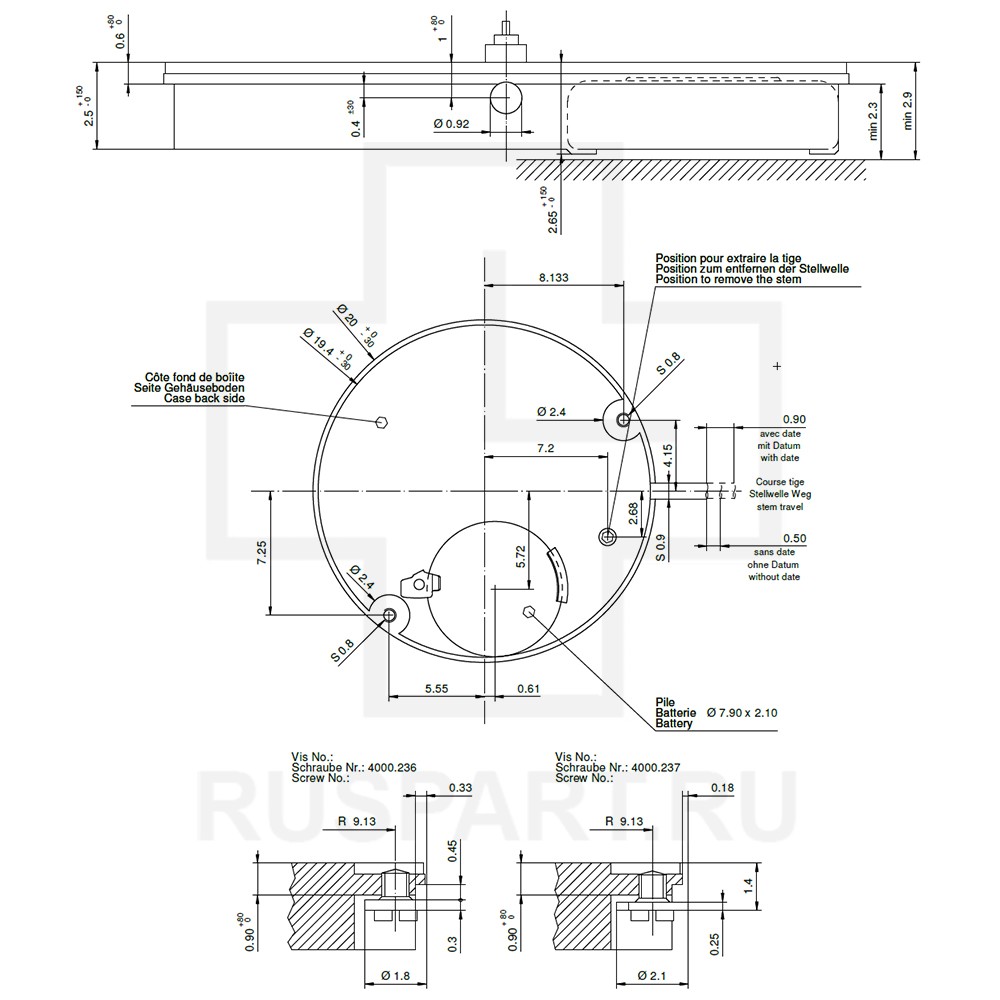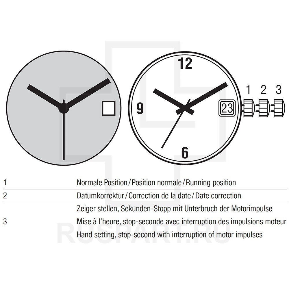 Механизм часовой в сборе RONDA 785 HH1 D3Описание: MOVEMENT RONDA 785, SIZE 8 3/4''', 3 HANDS, GILT, AIG1, HH1 (HAND FITTING HEIGHT No 1), DATE AT 3