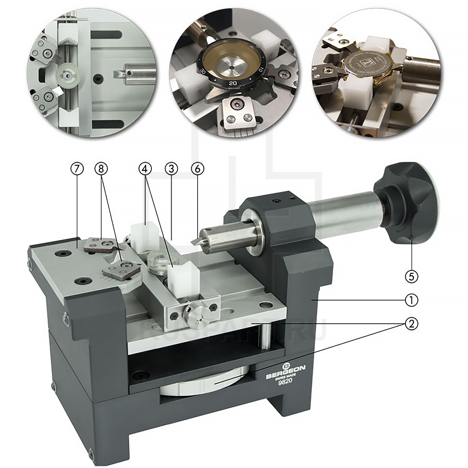 Устройство для снятия лицевых панелей и корпусов часов под давлением.Компактное и устойчивое устройство, позволяющее фиксировать навесное оборудование для удерживания корпуса часов