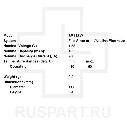 Батарейка кнопочная, оксид серебра RENATA SR44SWОписание: упаковка 10 шт на блистере