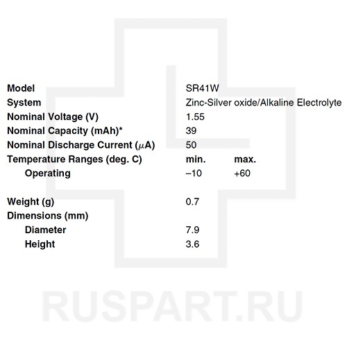 Батарейка кнопочная, оксид серебра RENATA SR41WОписание: упаковка 10 шт на блистере