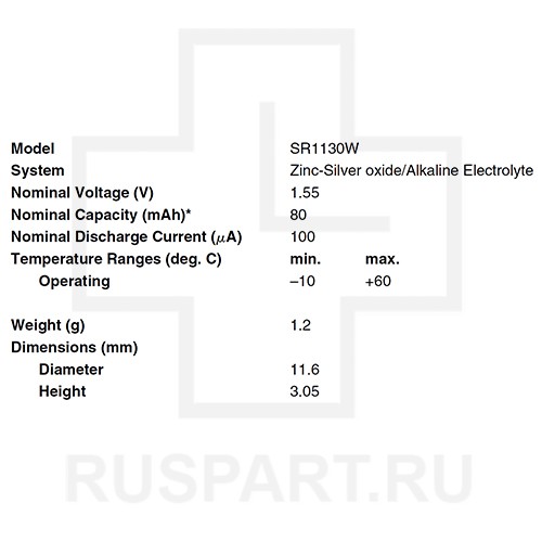Батарейка кнопочная, оксид серебра RENATA SR1130WОписание: упаковка 10 шт