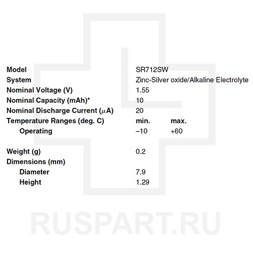 Батарейка кнопочная, оксид серебра RENATA SR712SWОписание: упаковка 10 шт